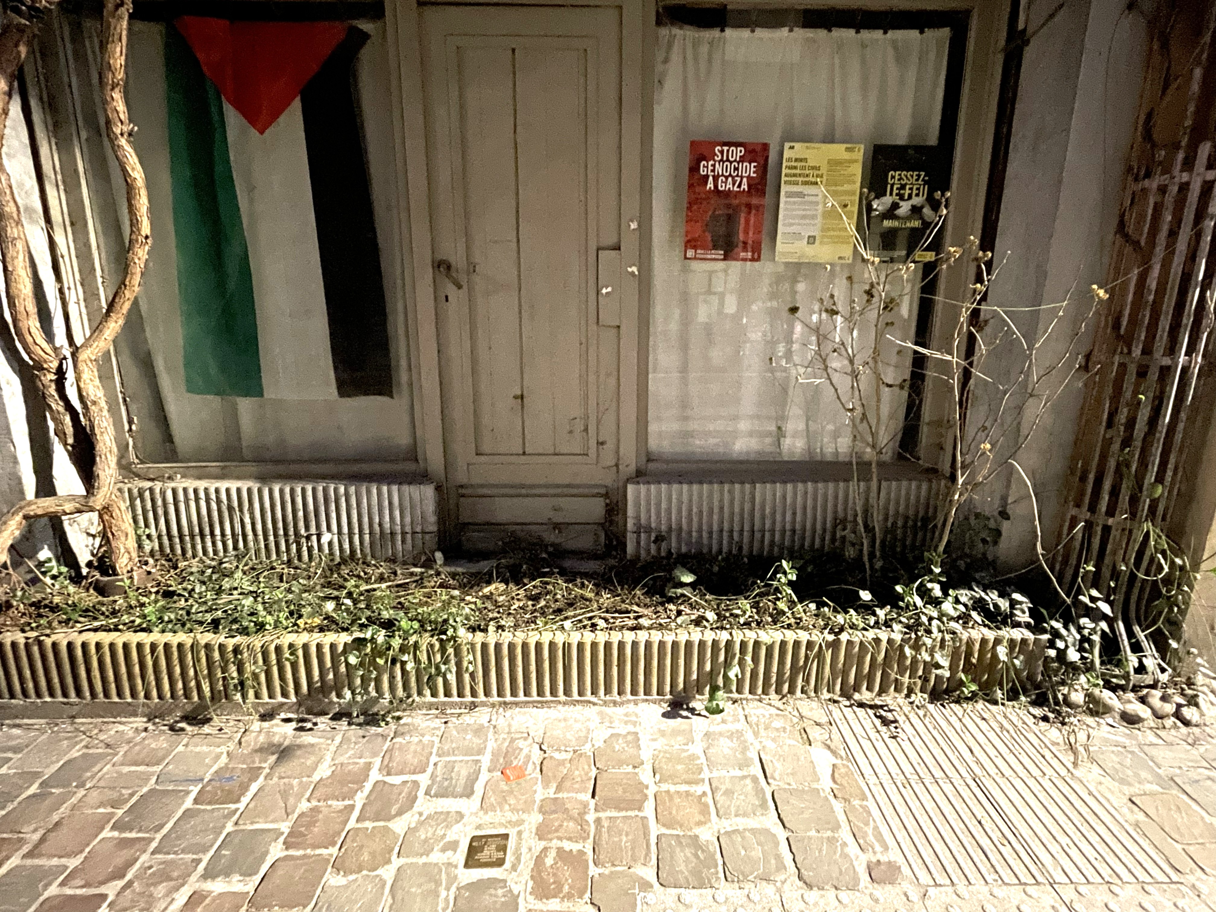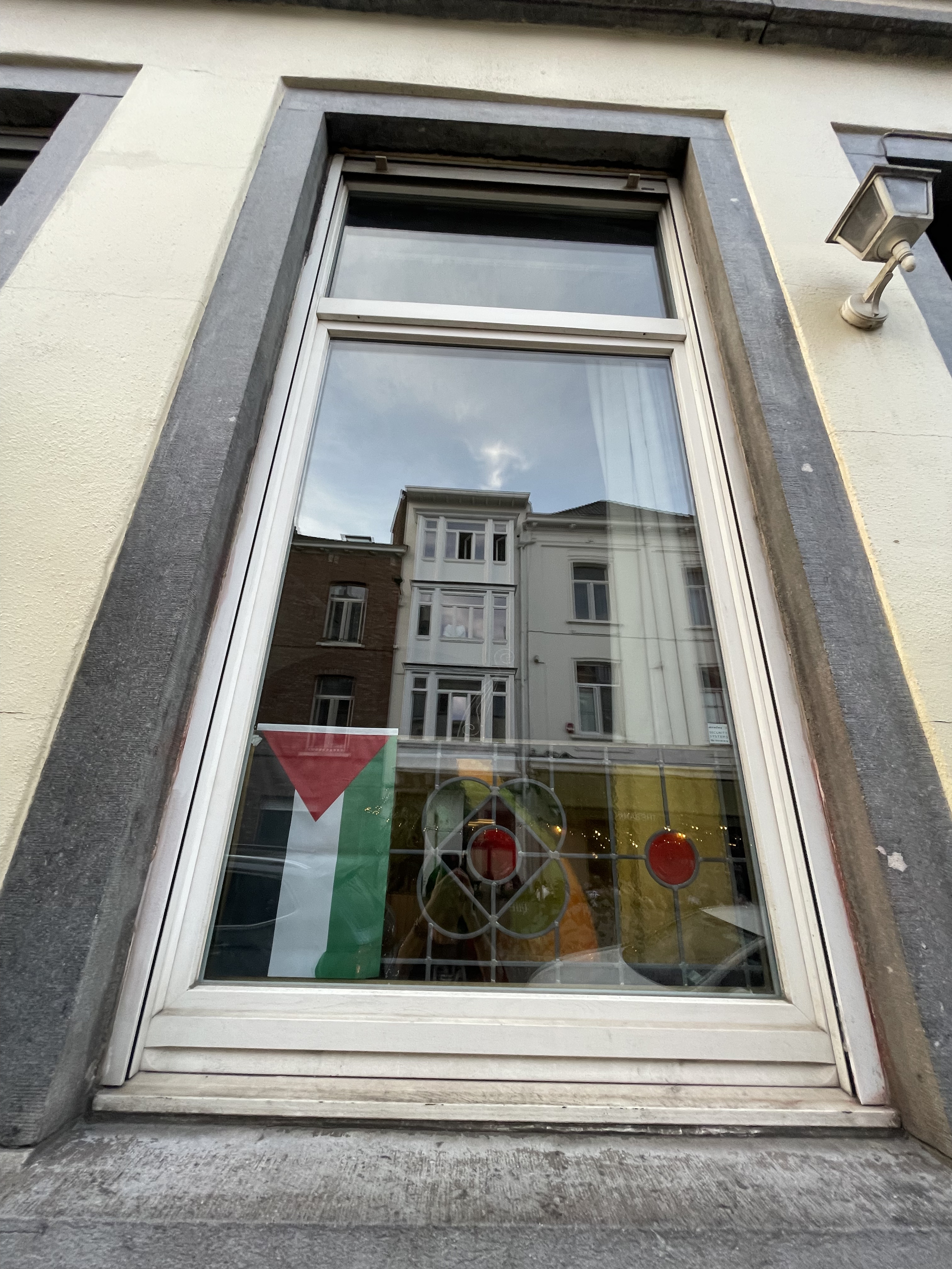 ガザが破壊されていくにつれ、連帯のシンボルはブリュッセル中に増殖し、次第に窓の内側から外側にも広がっていった。ブリュッセル自由大学のキャンパスでも、学生が自主運営する食堂の壁に大きな旗が堂々とかけられていた。大学だけではない。一部の公的施設でもパレスチナの旗を見かけた。風が身を切るように冷たい1月のある日、北駅から徒歩圏内にあるスカルベーク区庁舎を通りがかると、ブリュッセル首都圏の旗やEUの旗などと並んでパレスチナの旗が揺れていた。それは、草の根での抵抗の広がりがローカルな公共空間に変化を起こしていることを物語っていた。